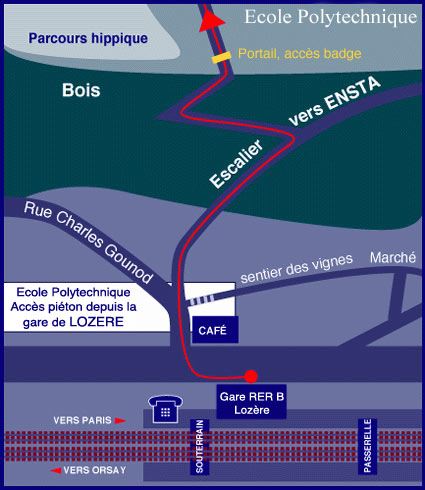 École polytechnique can be reached by feet from the Lozère RER B station within a 15 minutes walk that includes a stairway of about 300 steps. The walk is nice, but somewhat difficult when carrying heavy luggage or when it rains. When coming with luggage from Paris, we therefore recommend to use the RER B until the Massy-Palaiseau station, and then to take the bus 91.06 as described above.