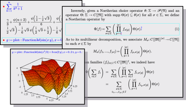 GNU TeXmacs is a free editing platform whith special feature for scientists. The software aims to provide a unified and user friendly framework for editing structured documents with different type of content (text, graphics, mathematics, interactive contents, etc.). The rendering engine uses high-quality typesetting algorithms so as to produce professionally looking documents, which can either be printed out or presented from a laptop.